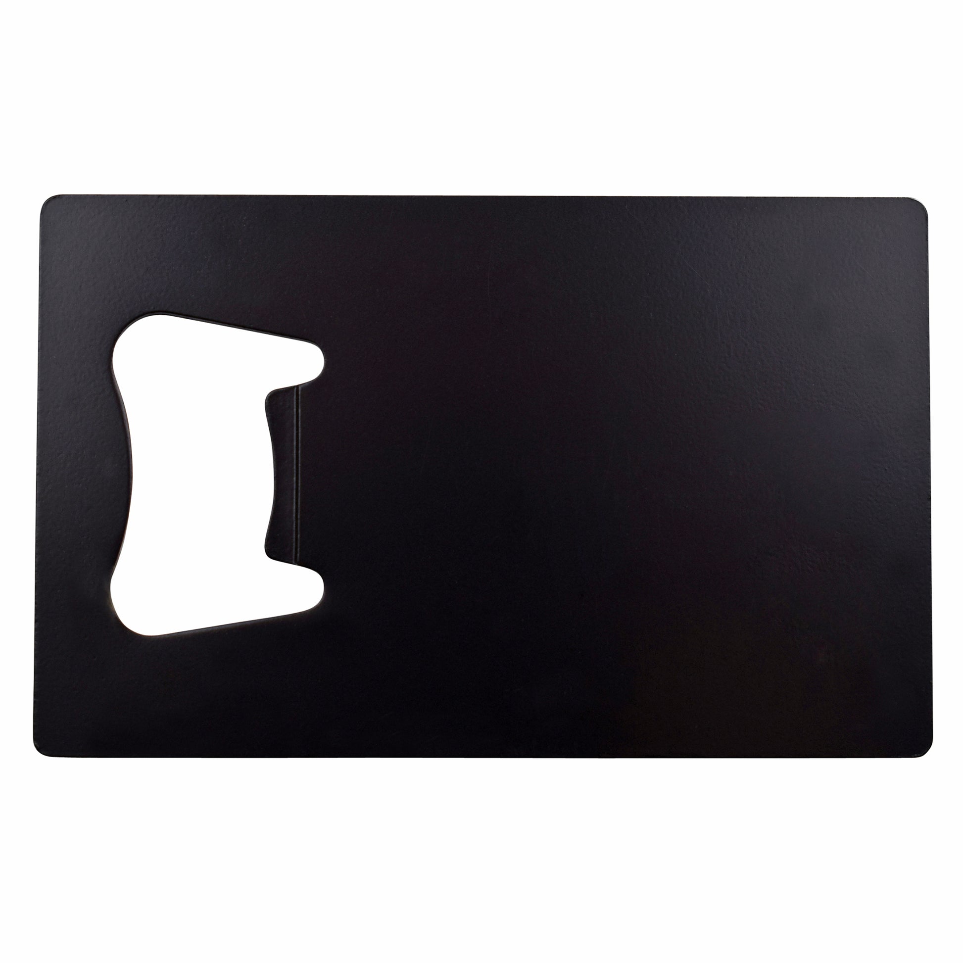 An unusual but very desirable rectangular black bottle opener that is perfect for custom engraving.