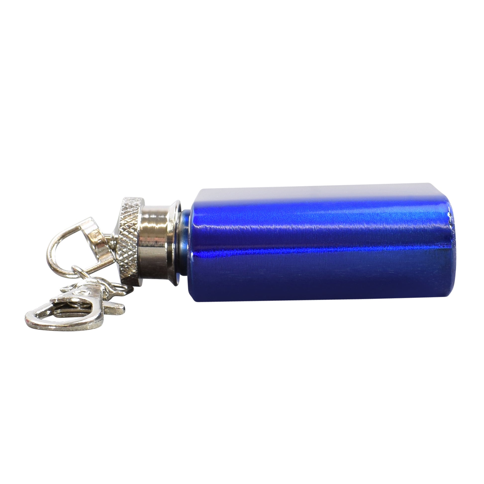 Mini hip flask keyring in metallic blue, perfect for personal and promotional corporate gifts