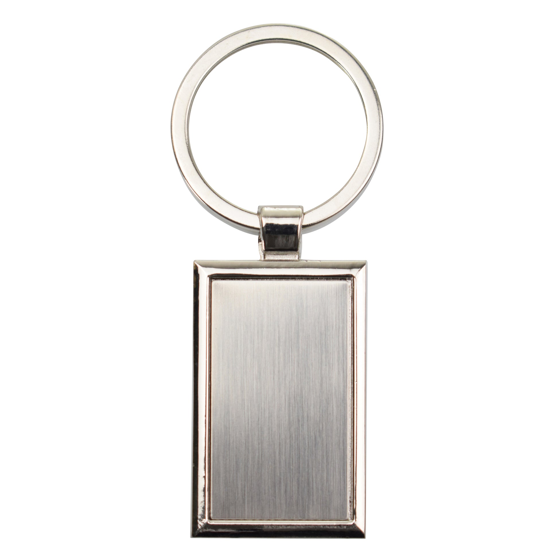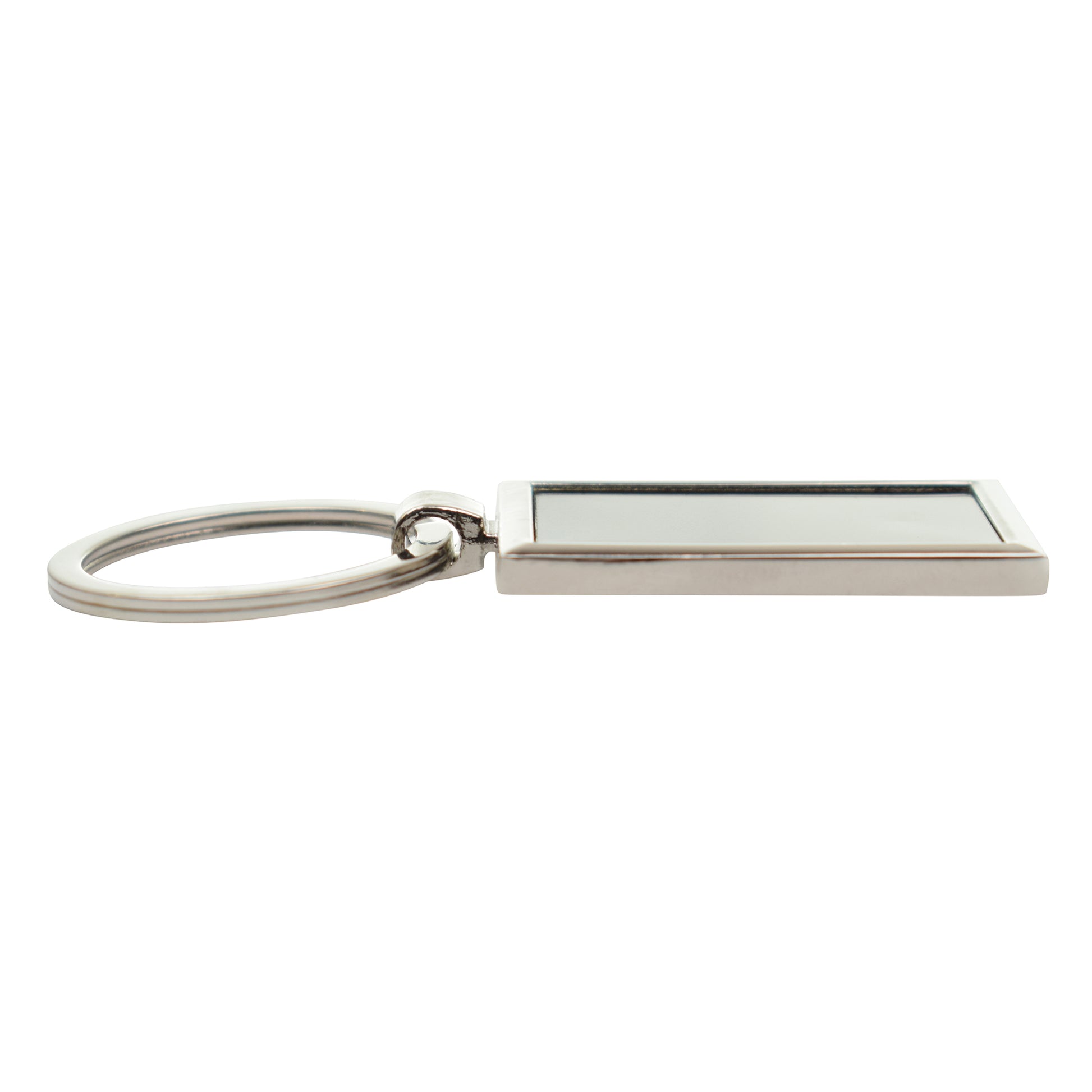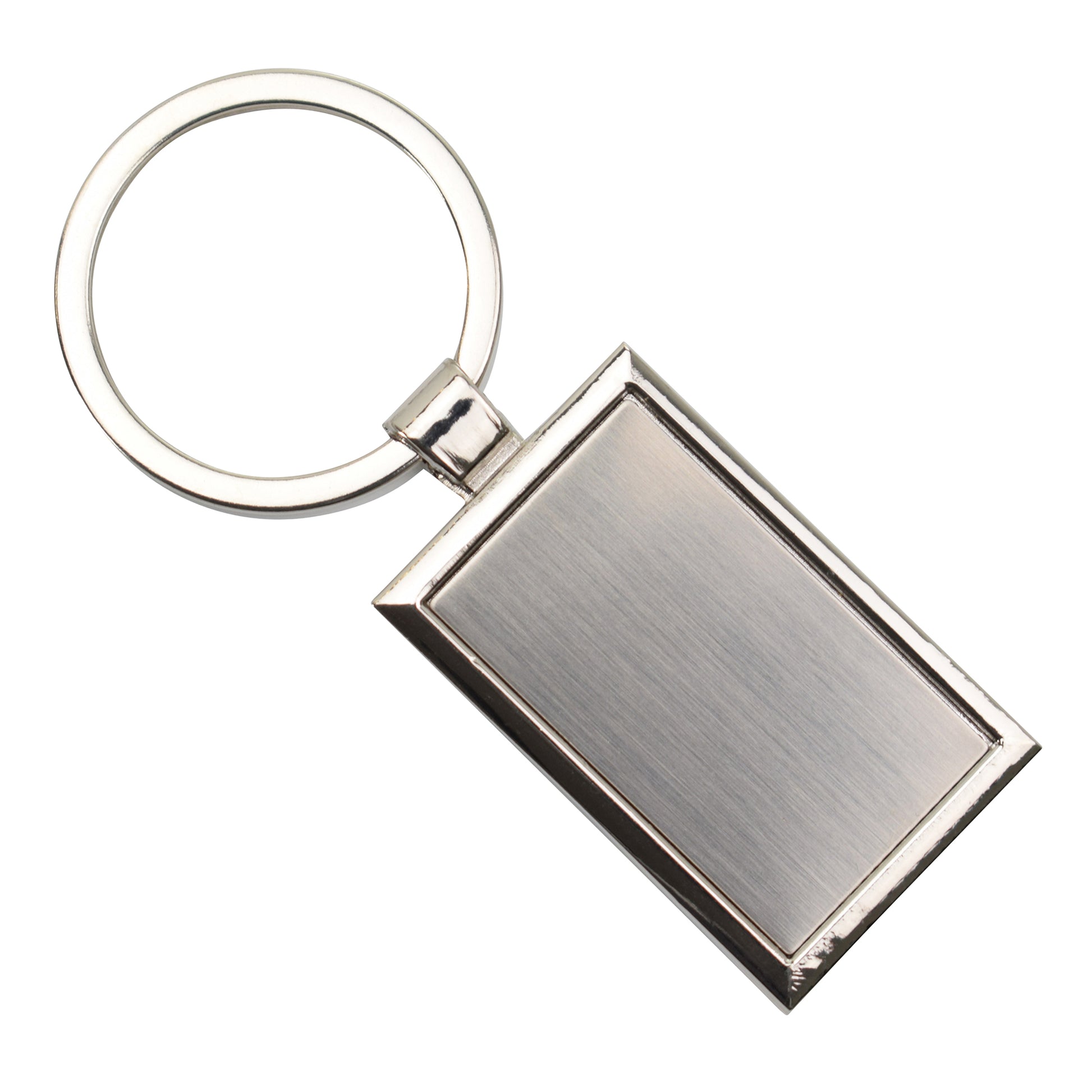 Rectangular shaped keyring with shiny chrome finish and brushed steel centre