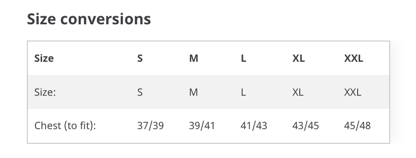 Size S M L XL XXL Size: S M L XL XXL Chest (to fit): 37/39 39/41 41/43 43/45 45/48