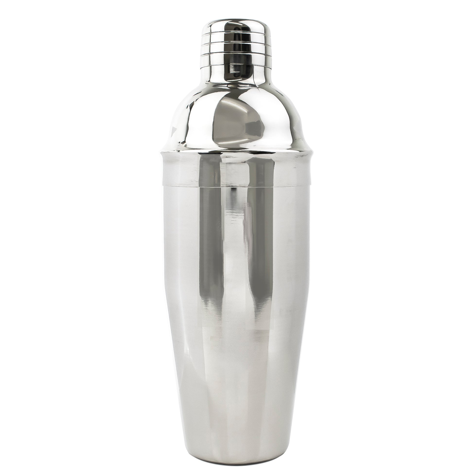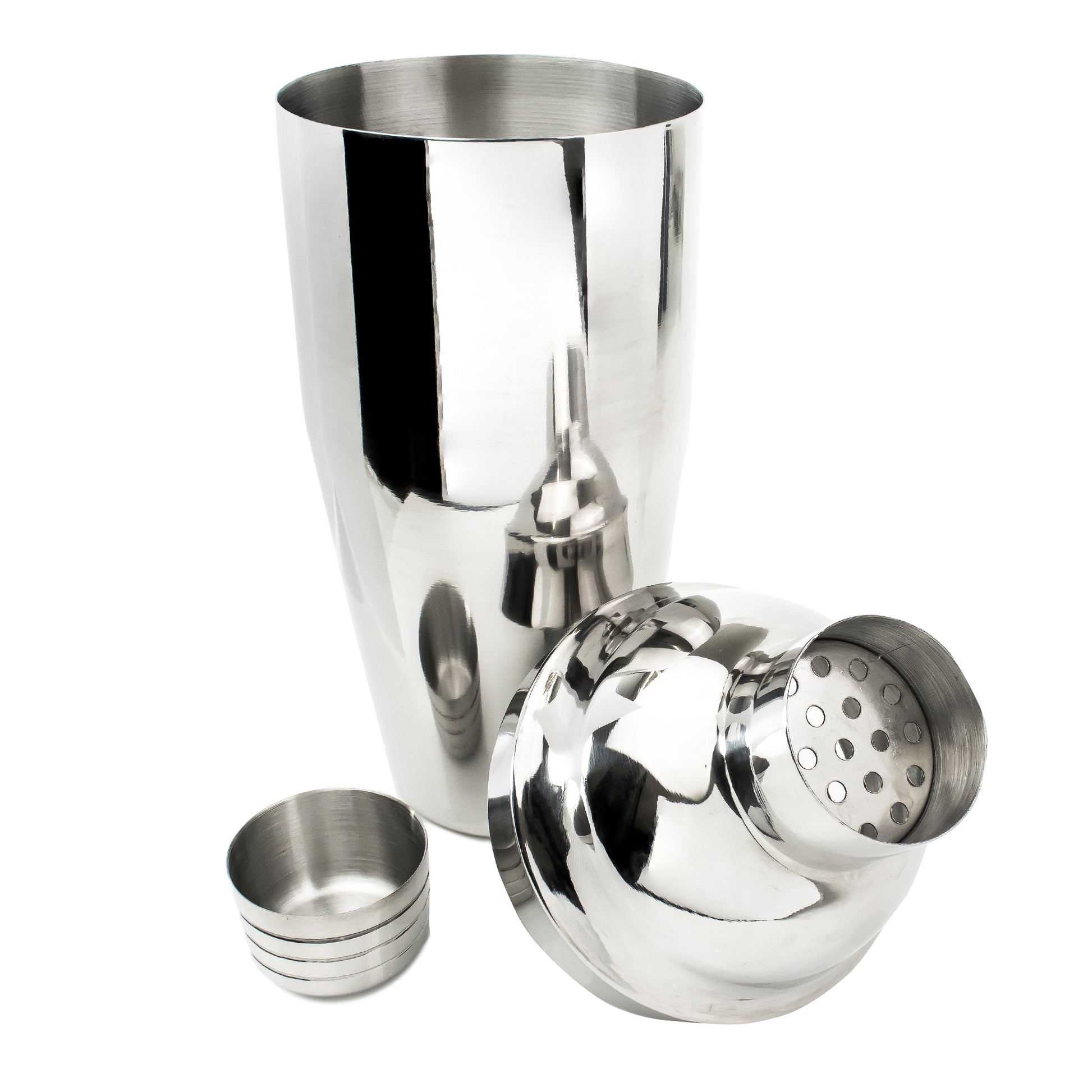 A shiny professional stainless steel cocktail shaker, with a built in strainer and a shot glass. With a large capacity of 750ml. The shaker is easy to clean making it super enjoyable and easy to make delicious cocktails whether it's for at home or bars