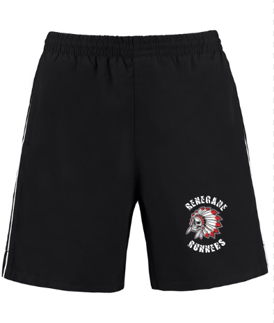 Elasticated drawcord waist. Two side zipped pockets. Straight hem. Contrast piping down outside leg. Side vents. Polyester mesh brief lining. Gamegear® woven label.