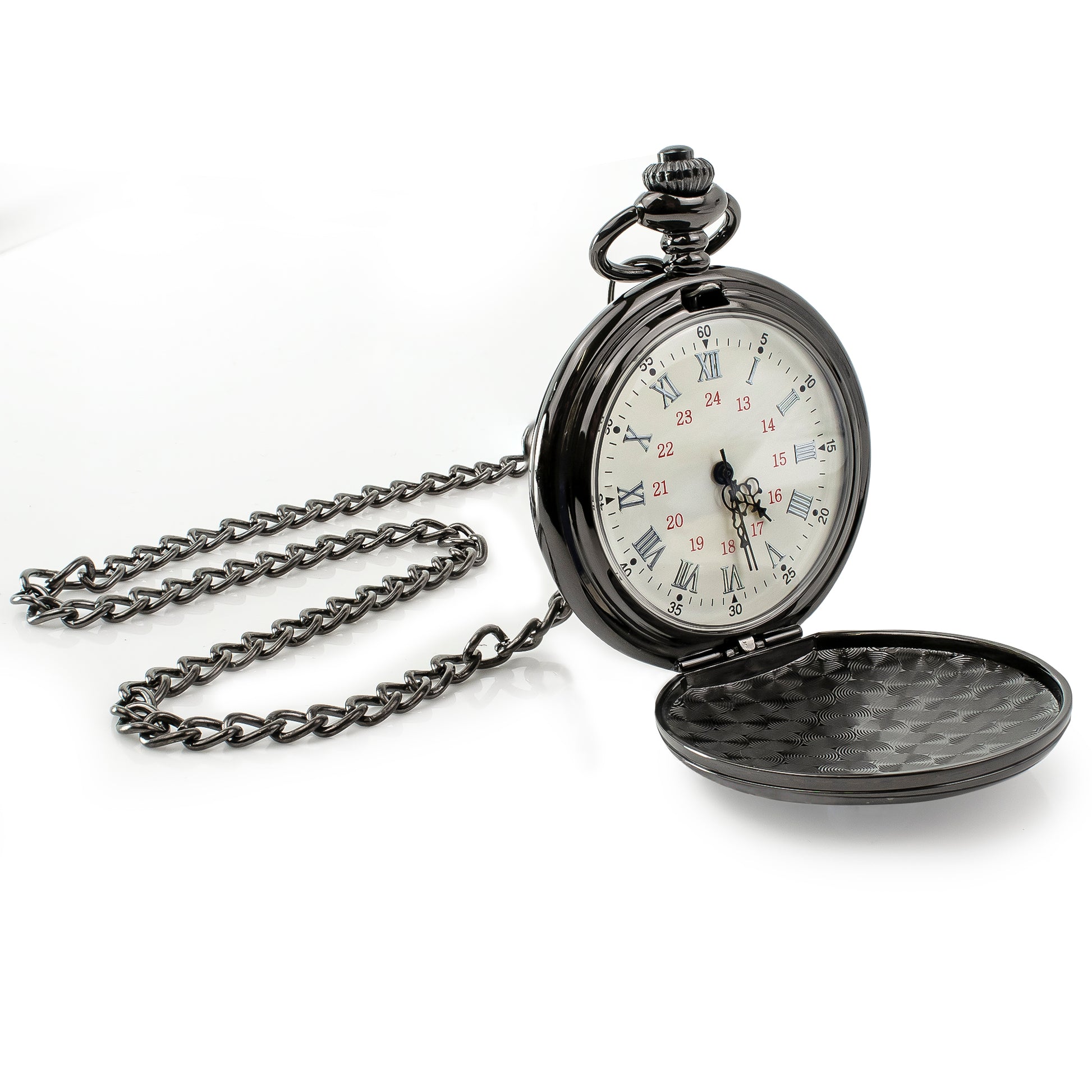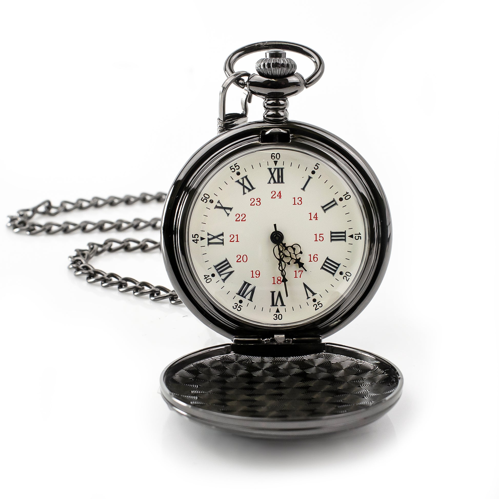 Black coloured pocket watch with a 24 dial and roman numerals. These budget pocket watches are similar to our standard range but use lower cost alternatives to the Japanese movements.