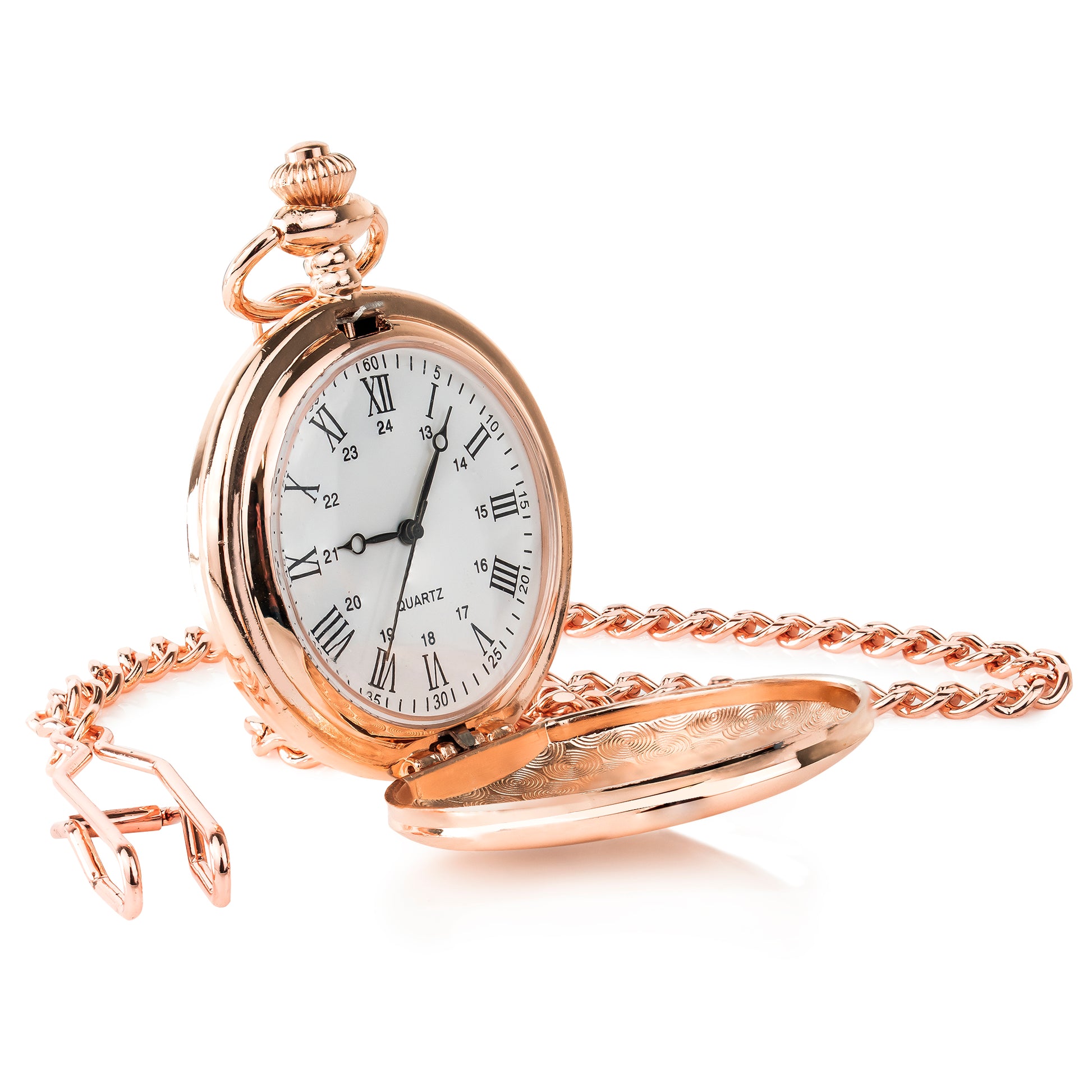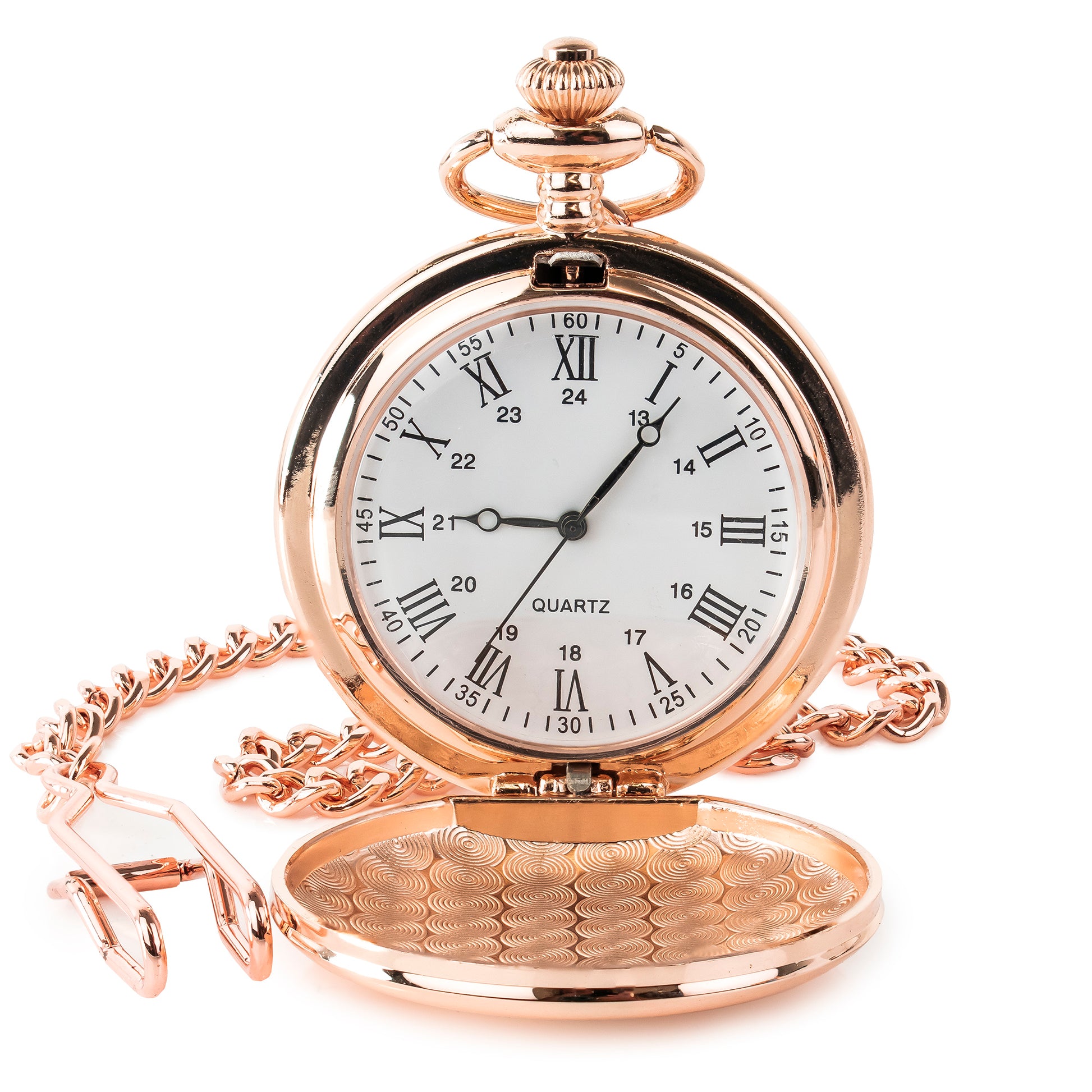 Rose gold coloured pocket watch with high-quality Japanese quartz movement.
