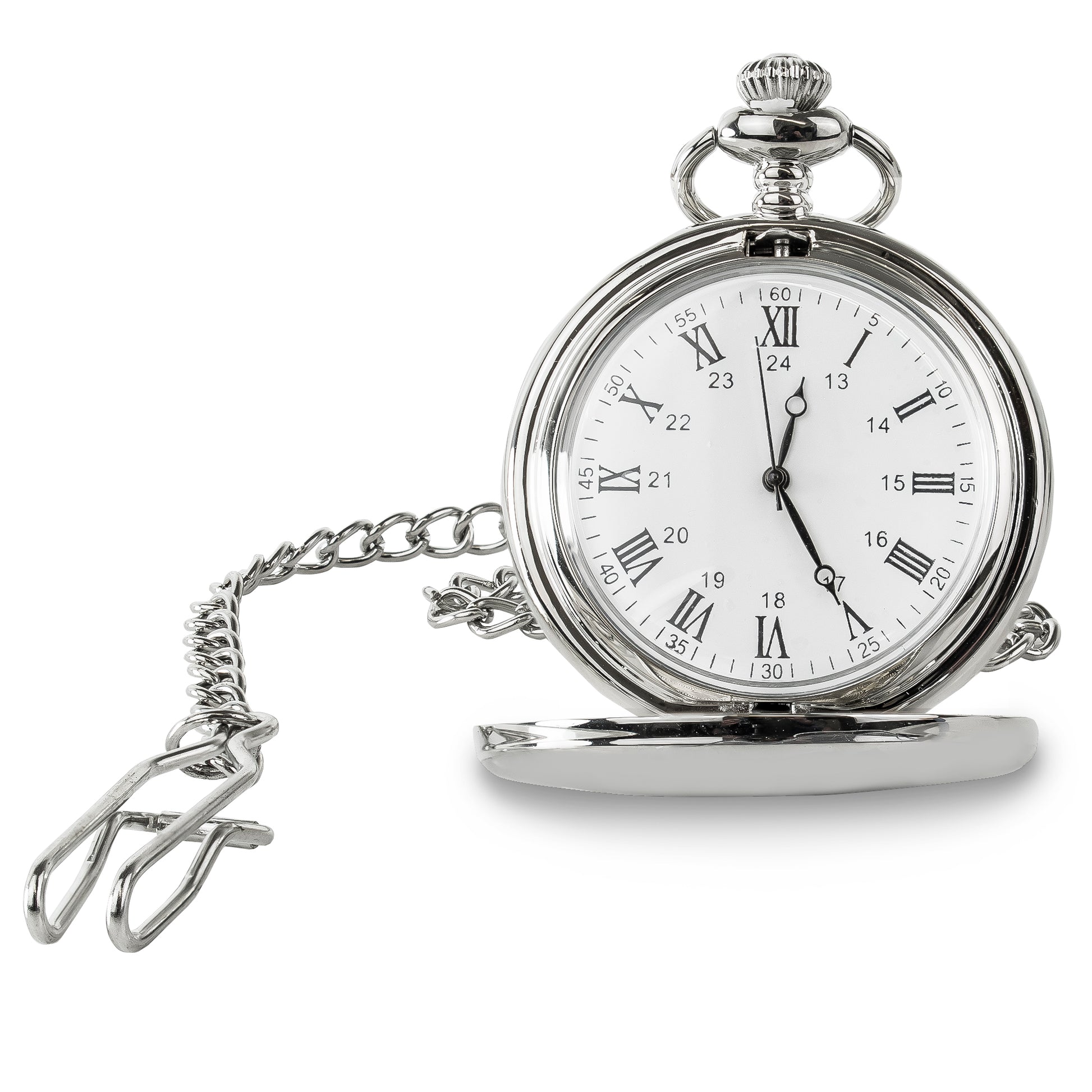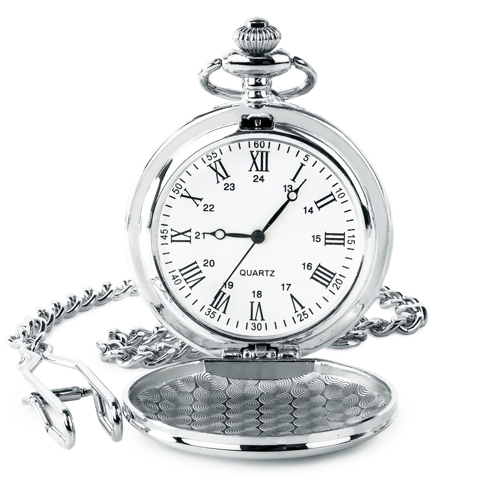 Silver coloured pocket watch with high-quality Japanese quartz movement.