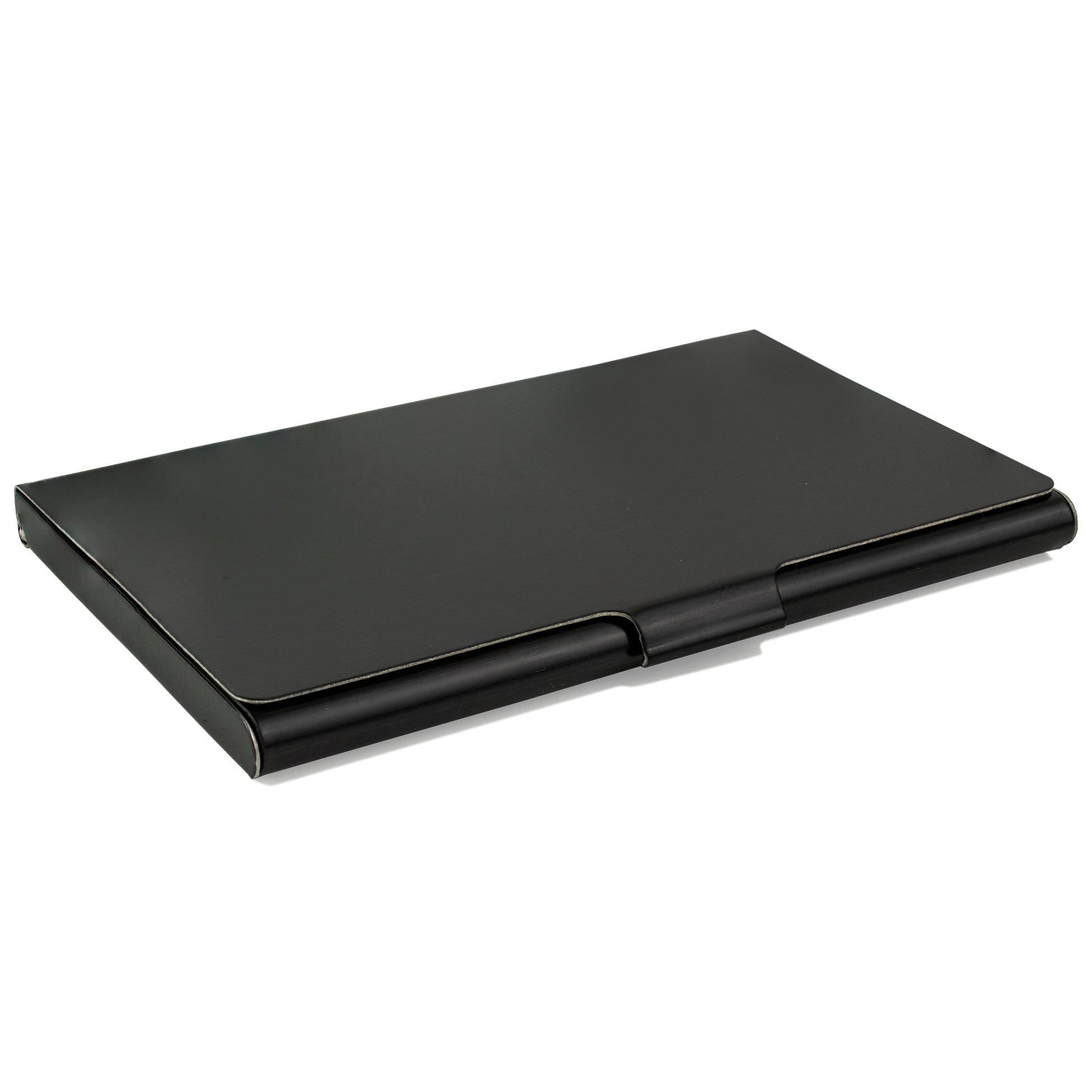 Shiny and sturdy black business card holder, made out of stainless steel with a velvet black interior, perfect for on the go meetings and networking.