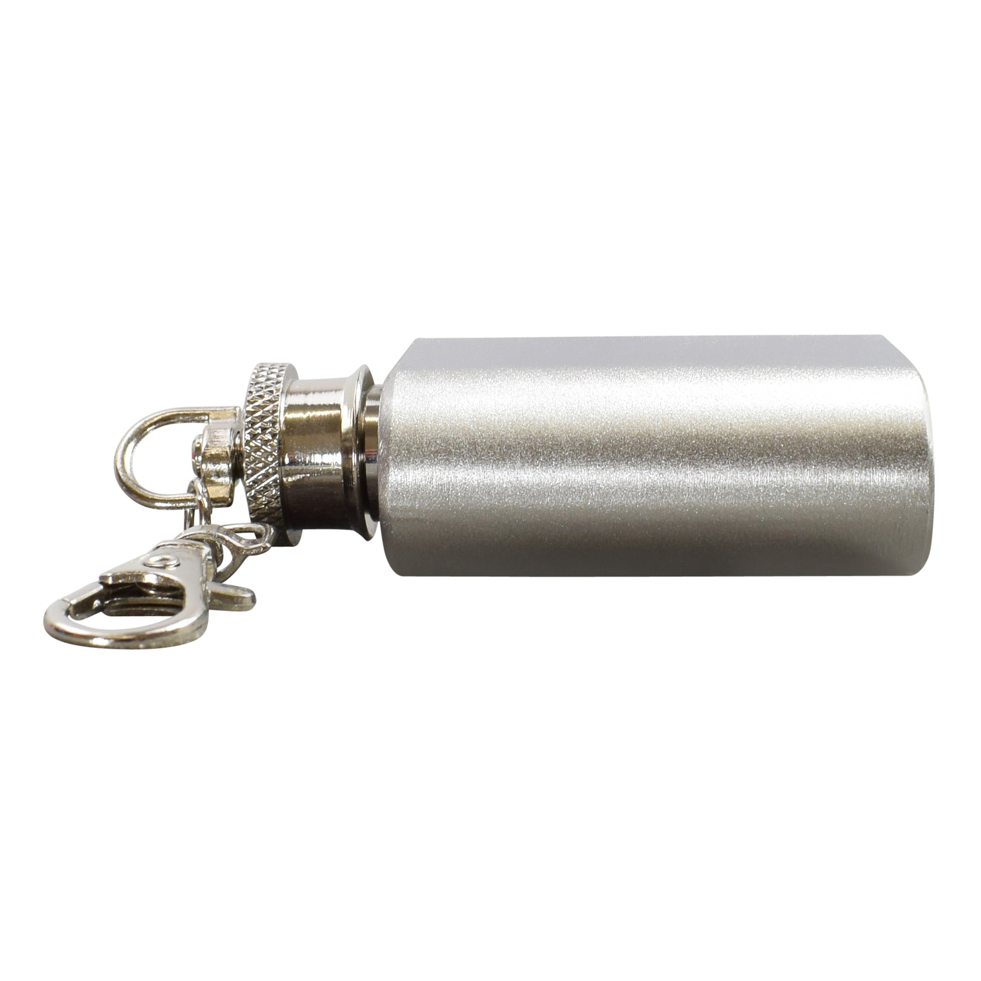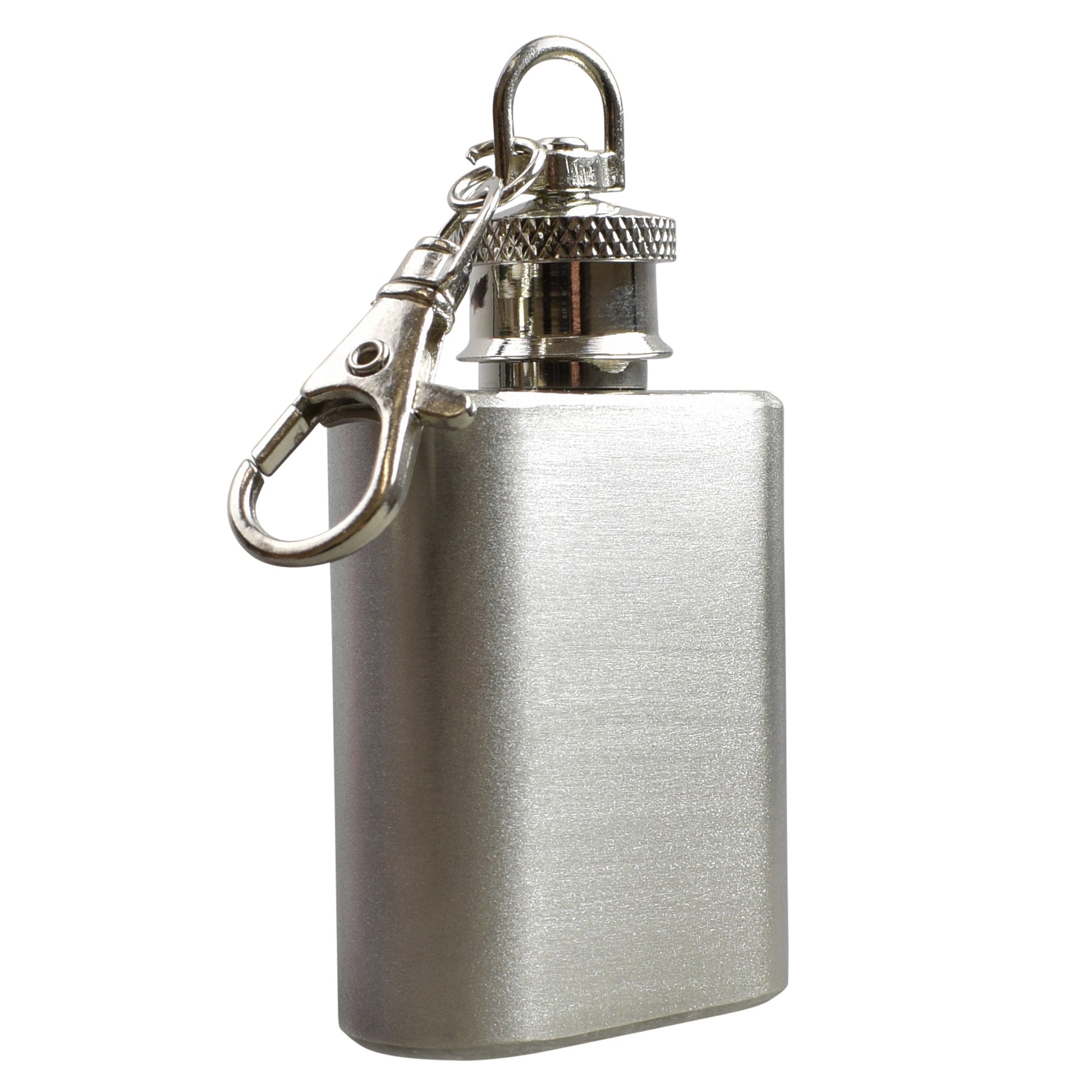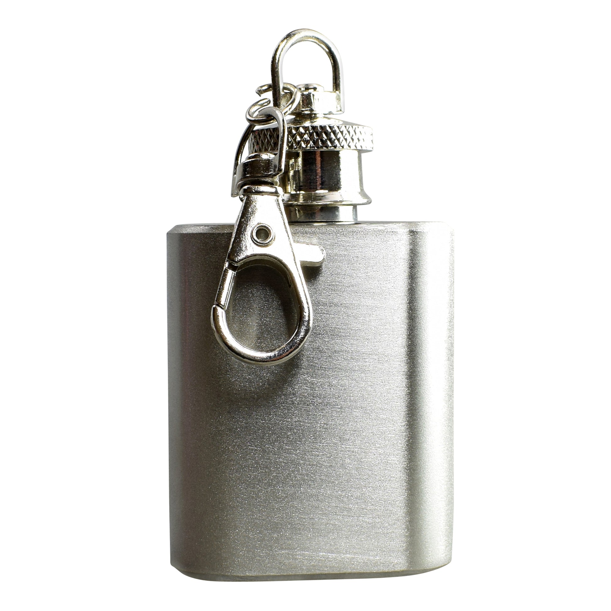 Mini hip flask keyring in brushed steel, perfect for personal and promotional corporate gifts.