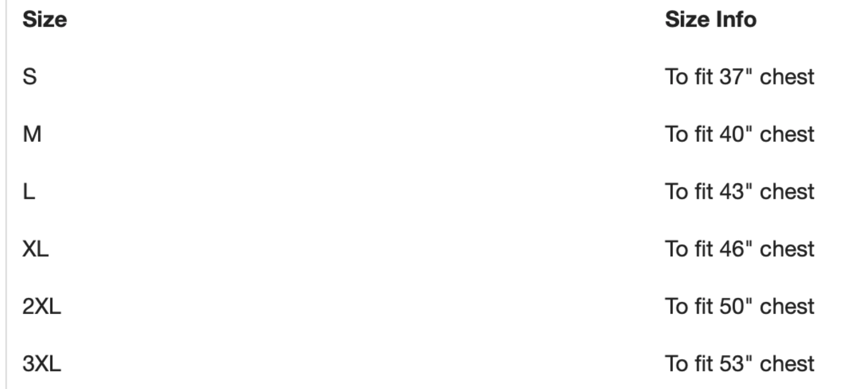 XS 30/32" S 34/36" M 38/40" L 42/44" XL 46/48" 2XL 50/52" 3XL 54/56''